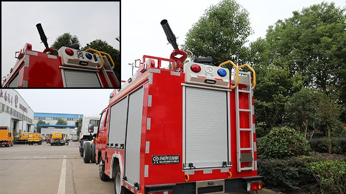 在箱體尾部上方還有兩個紅藍(lán)兩色的爆閃燈,它們的作用是讓出警時的消防車更加醒目,同時提醒行人和車輛及時避讓。箱體尾門卷閘門旁邊還有一架折疊梯子,它的作用是方便消防員到車頂取用或操作消防設(shè)備,設(shè)計(jì)很周到。這個小細(xì)節(jié)也很重要,在尾門下面可以看到兩個黃色的圓環(huán),它們的作用是能夠讓這臺泡沫消防車在必要時牽引車輛或清理障礙。