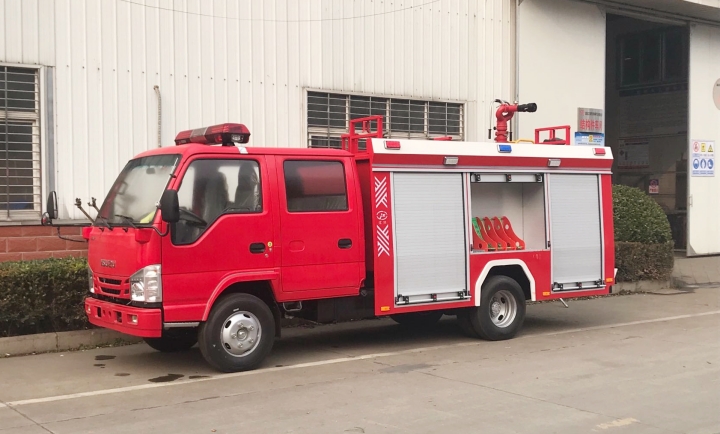 五十鈴2.5噸水罐消防車采用五十鈴QL1070BUKWY底盤改裝而成。整車由消防員乘員室和車身兩大部分組成,乘員室為原裝雙排,可乘坐2+3人,該車為內倉罐結構,車身前部為水罐+器材箱,后部為泵房。載液罐體為優質碳鋼,與底盤采用彈性連接,載水2000kg,裝備了上海雄真消防設備有限公司生產CB10/20-XZ型消防泵,額定流量30L/S,車頂安裝成都威斯特消防機械有限公司生產的PS20W型車用消防炮。